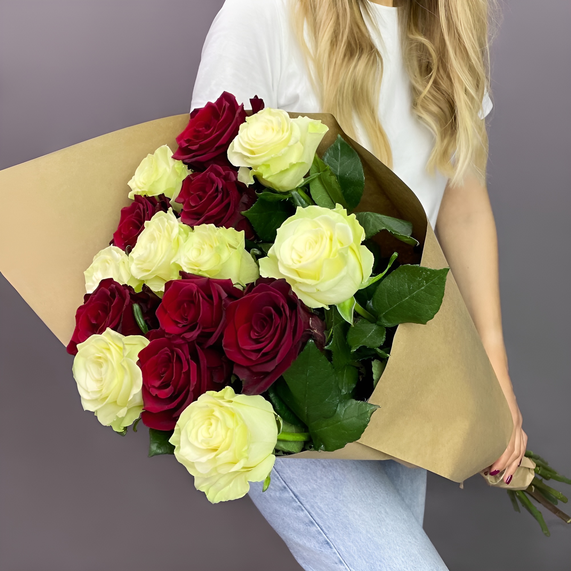 Уникальная композиция из красных и белых роз — воплощение гармонии противоположностей. Идеальный выбор для влюбленных, юбилеев или особых признаний. Купить букет роз Нефтегорск.