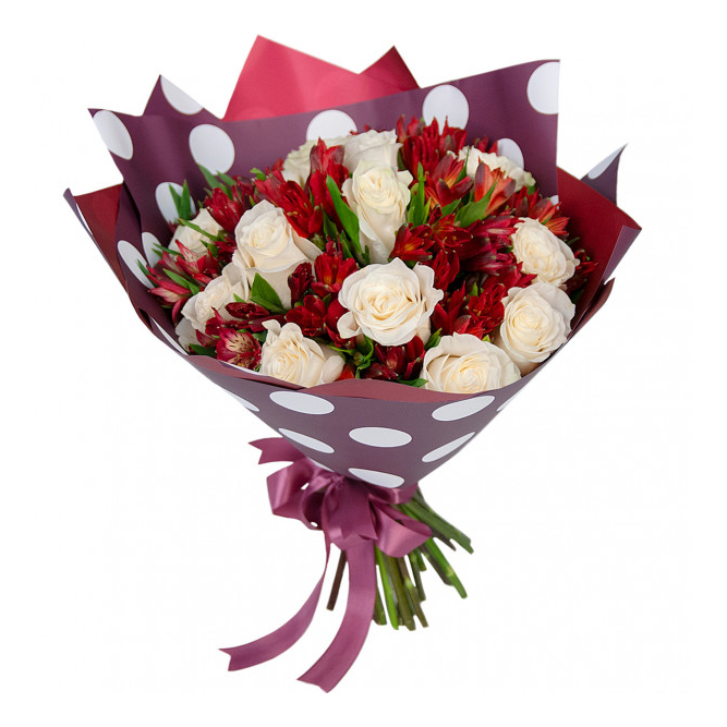 Контрастный букет сочетает нежные белые розы и яркие красные альстромерии. Идеальный подарок для выражения искренних чувств. Букет с доставкой на дом в Нефтегорске.