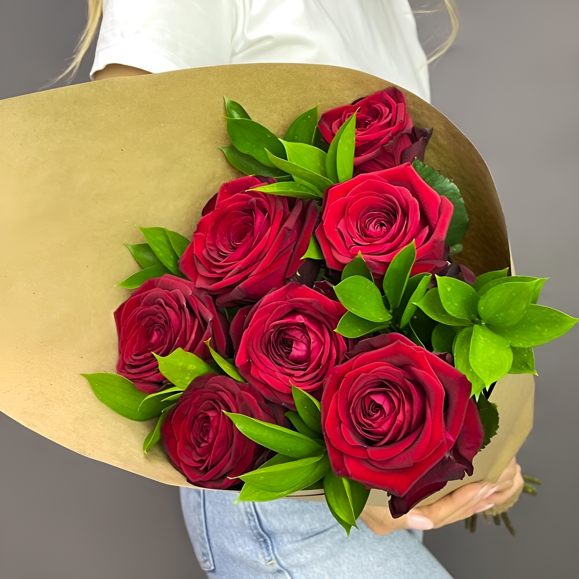 Элегантный букет из красных роз с декоративным рускусом в экологичной крафтовой упаковке — идеальное сочетание страсти и стиля. Яркие бутоны на фоне изумрудной зелени создают эффектный контраст. Отличный выбор для романтического признания или особого торжества. Доставка свежих цветов в Нефтегорске от Афло.