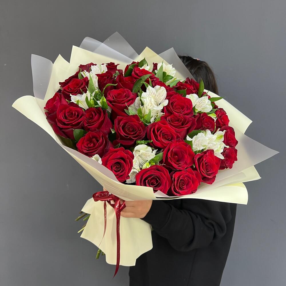 Волнующая композиция из алых роз и белоснежных альстромерий — воплощение совершенной любви. Идеальный выбор для романтического признания или годовщины отношений. Заказать букет цветов с доставкой в Нефтегорске.