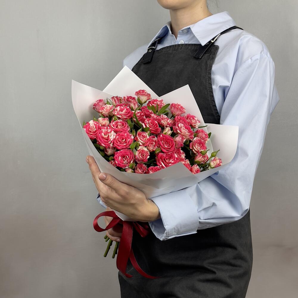 Яркая композиция из 9 кустовых роз «Фейерверк» с переливами розовых и белых оттенков. Создает праздничное настроение в любом интерьере. Купить розы в Нефтегорске.