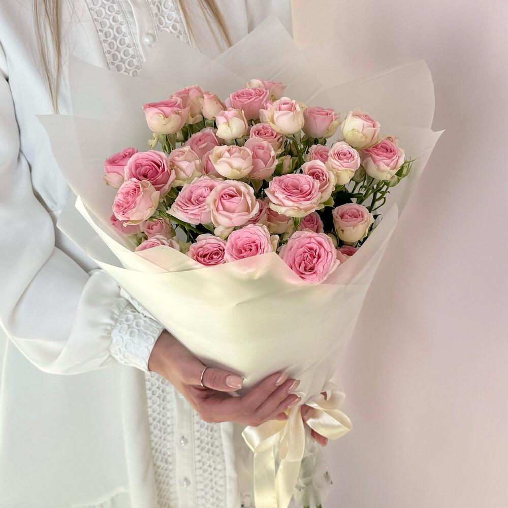 Роскошный букет «Нежный аромат» из кустовых розовых роз в дизайнерской упаковке — воплощение изысканности и хорошего вкуса.