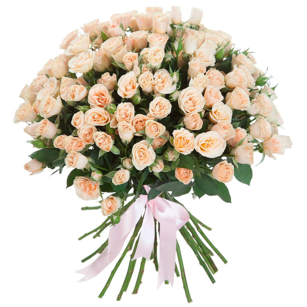 Очаровательный букет из свежих персиковых кустовых роз — символ грации и теплых чувств.