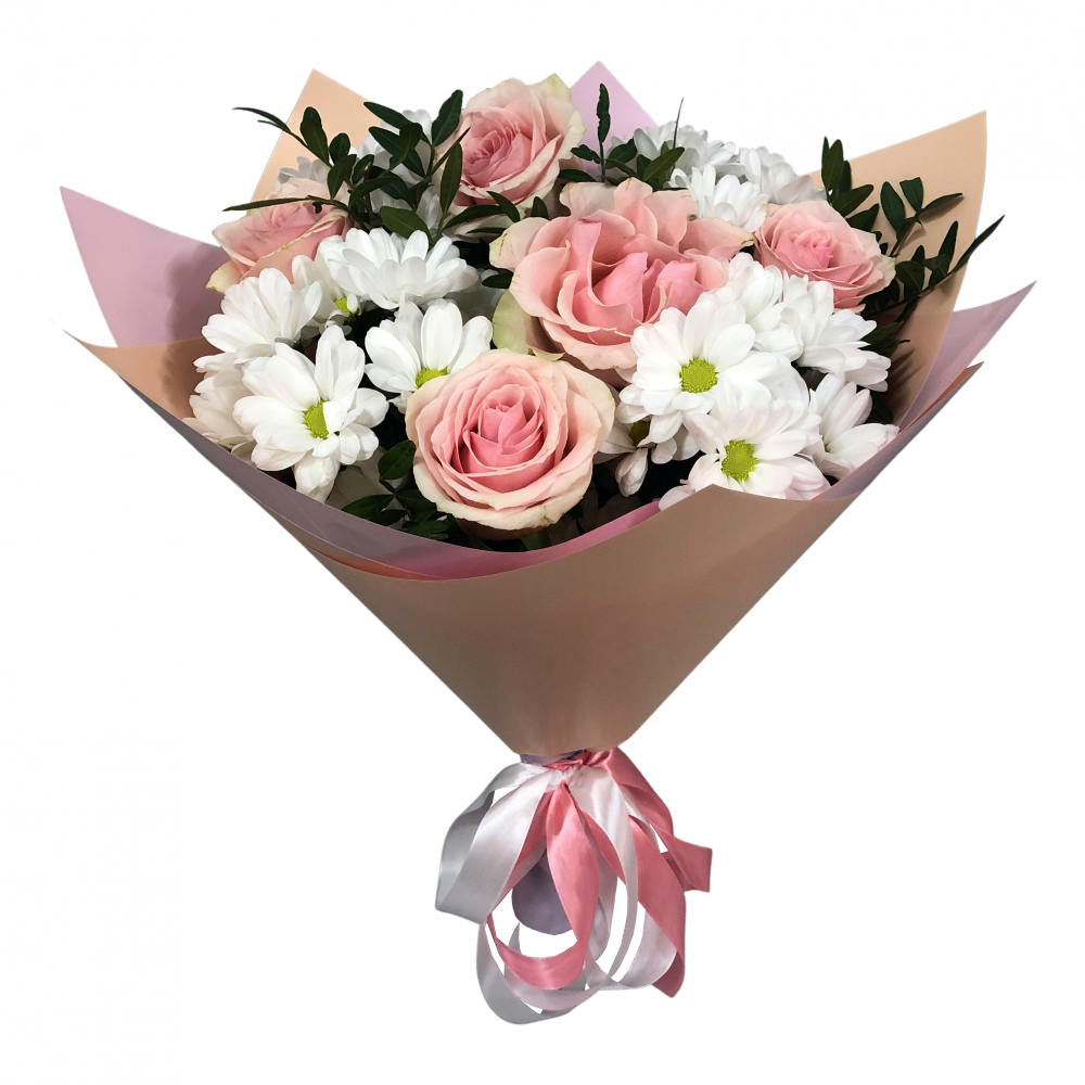 Очаровательный букет сочетает нежно-розовые розы и пышные хризантемы, создавая идеальный баланс между романтикой и практичностью. Эти свежие цветы будут радовать своей красотой долгое время. Идеальный выбор для особого признания или теплого поздравления. Магазин цветов Нефтегорск.