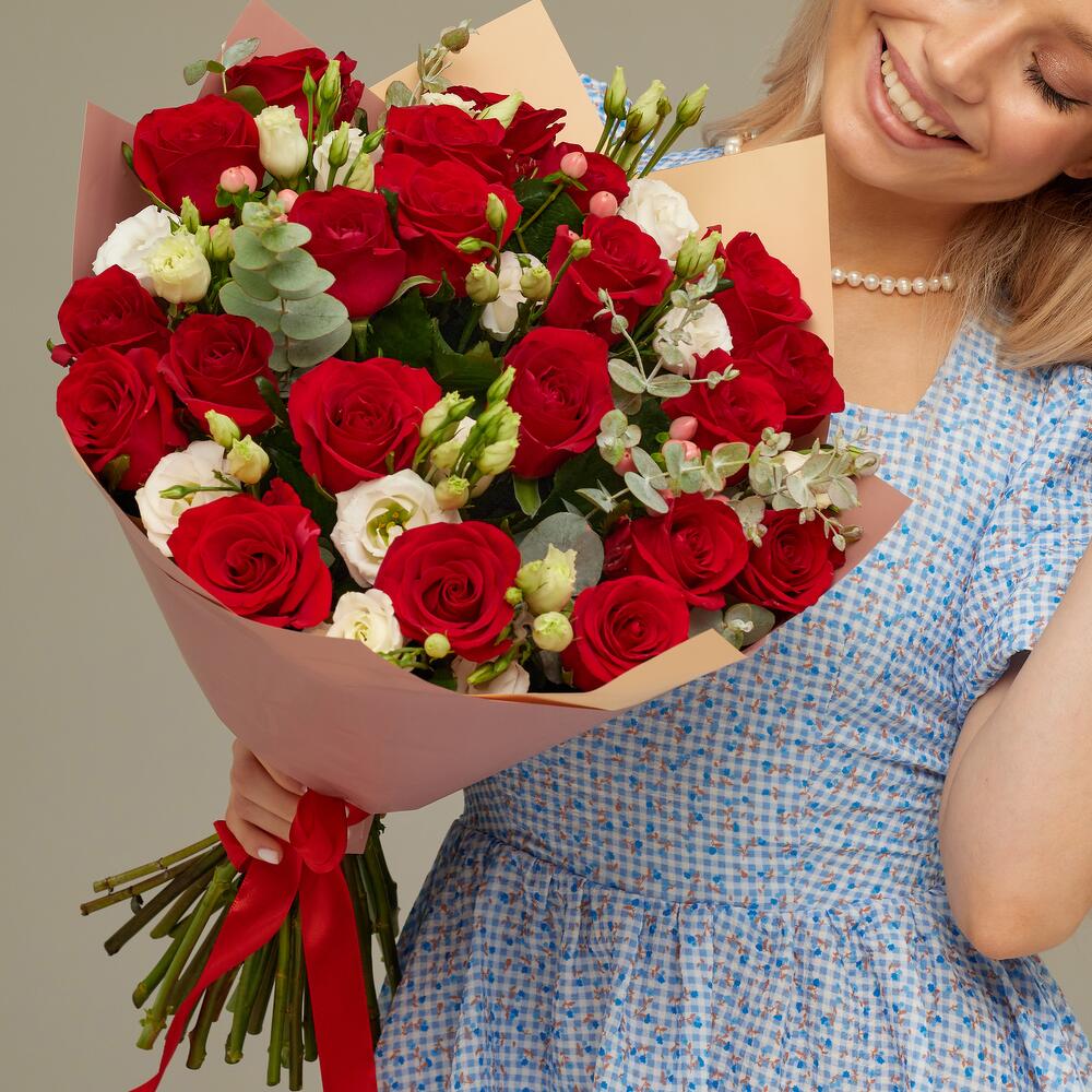 Изысканная композиция из 21 красной розы, 5 эустом и зелени — воплощение страсти и нежности.