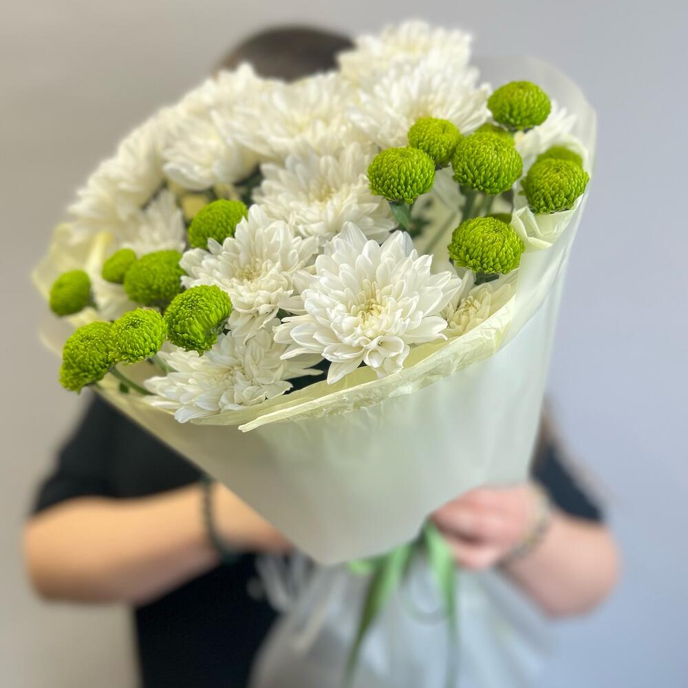 Уникальная композиция из белоснежных кустовых хризантем и редких зеленых «Филин Грин» — воплощение свежести и элегантности. Идеальный выбор для ценителей необычных цветочных решений. Букет цветов с доставкой Нефтегорск.