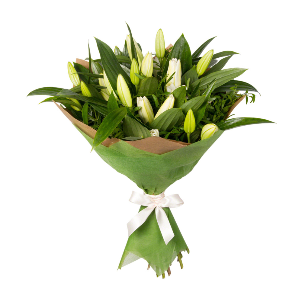 Утонченный букет из белых лилий с нежной фисташковой зеленью — воплощение свежести и изысканности.